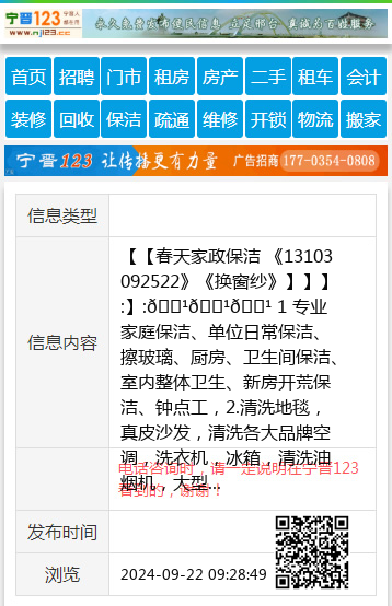 【【春天家政保洁 《13103092522》《换窗纱》】】】:】:🌹🌹🌹 1 专业家庭保洁、单位日常保洁、擦玻璃、厨房、卫生间保洁、室内整体卫生、新房开荒保洁、钟点工,2.清洗地毯,真皮沙发,清洗各大品牌空调,洗衣机,冰箱,清洗油烟机,大型厨房烟道清洗,可出检测报告。3 .清洗各种布艺沙发套。地板打蜡,地板砖美缝,4清洗地暖,采用先进的脉冲技术,干净彻底。清洗自来水管。5【换窗纱】。订做隐形窗纱,金刚网纱窗。等家庭活。开锁,换各种锁芯!欢迎新老客户来电 地址、电话:13103092522 |
