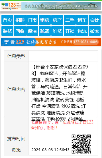 【邢台平安家政保洁2222098】:家庭保洁,开荒保洁擦玻璃,擦厨房卫生间,修水管,马桶疏通。日常保洁 开荒保洁 玻璃清洗 地毯清洗 油烟机清洗 瓷砖美缝 地板打蜡 空调清洗 沙发清洗 灯具清洗 地暖清洗 外墙玻璃幕清洗 甲醛检测与治理等我公司提供全邢台市区和郊区内保洁清洗等服务,含家庭保洁,办公室保洁、酒店客房保洁、宾馆保洁、医院学校开荒保洁、新房装修后保洁清理服务、企业搬迁整理、高楼外墙清洗、学校保洁、楼宇玻璃清洗 家电清洗 管道疏通 甲醛检测治理等多种全方位服务。 地址、电话:2222098--13180566945 |