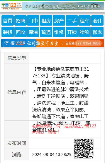 【专业地暖清洗家庭电工3173133】:专业清洗地暖,暖气,自来水管道,电暖器,,用最先进的脉冲清洗技术,清洗干净彻底,效果明显,清洗过程干净卫生,射蛋深度清洗,效果立竿见影。长期疏通下水道,家庭电工,地暖清洗 地址、电话:邢台市3173133---13231925363