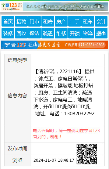 【清新保洁 2221116】:提供;钟点工、家庭日常保洁,新居开荒,擦玻璃;地板打蜡;厨房、卫生间清洗;疏通下水道,家庭电工,地暖清洗,开🔒锁换🔒锁。 地址、电话:13082032292
