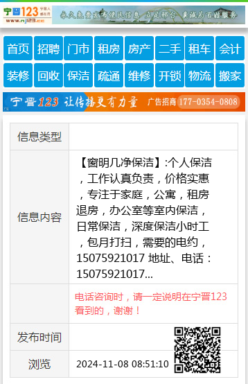 【窗明几净保洁】:个人保洁,工作认真负责,价格实惠,专注于家庭,公寓,租房退房,办公室等室内保洁,日常保洁,深度保洁小时工,包月打扫,需要的电约,15075921017 地址、电话:15075921017