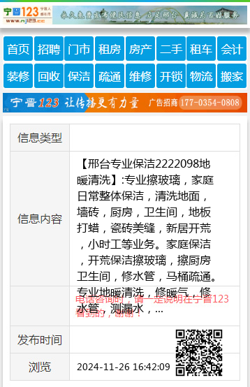 【邢台专业保洁2222098地暖清洗】:专业擦玻璃,家庭日常整体保洁,清洗地面,墙砖,厨房,卫生间,地板打蜡,瓷砖美缝,新居开荒,小时工等业务。家庭保洁,开荒保洁擦玻璃,擦厨房卫生间,修水管,马桶疏通。专业地暖清洗,修暖气,修水管,测漏水,换分水器安装维修水管,暖气,太阳能,阀门,卫生洁具等;做防水,补漏,墙地砖拆除,砸墙等多种活及杂活;疏通马桶,下水道,改修下水道; 地址、电话:2222098--13180566945 |