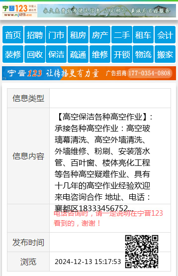 【高空保洁各种高空作业】:承接各种高空作业:高空玻璃幕清洗、高空外墙清洗、外墙维修、粉刷、安装落水管、百叶窗、楼体亮化工程等各种高空疑难作业、具有十几年的高空作业经验欢迎来电咨询合作 地址、电话:襄都区18333456752