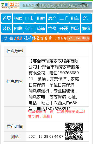 【邢台市瑞芳家政服务有限公司】:邢台市瑞芳家政服务有限公司,电话15076868911,承接,开荒保洁,家庭日常保洁,单位日常保洁,清洗油烟机,专业擦玻璃,清洗家电,等等保洁 地址、电话:地址中兴西大街666号,电话15076868911