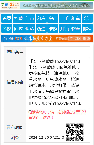 【专业擦玻璃15227607143】:专业擦玻璃,暖气维修,更换暖气片,清洗地暖,换分水器、暖气热水器,检测暗管漏水,水钻打眼,疏通下水道,马桶异物抽取,水电维修15227607143 地址、电话:邢台市15227607143