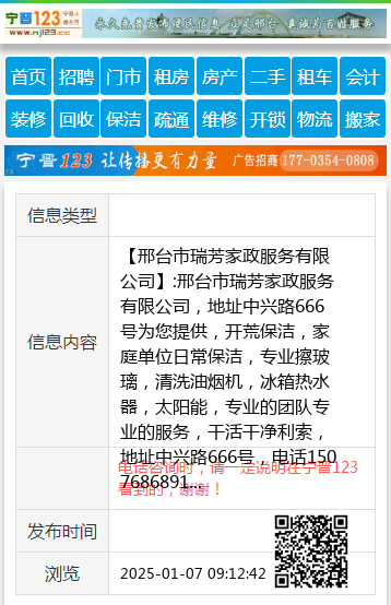 【邢台市瑞芳家政服务有限公司】:邢台市瑞芳家政服务有限公司,地址中兴路666号为您提供,开荒保洁,家庭单位日常保洁,专业擦玻璃,清洗油烟机,冰箱热水器,太阳能,专业的团队专业的服务,干活干净利索,地址中兴路666号,电话15076868911 地址、电话:地址中兴路666号,电话15076868911