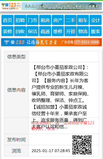 【邢台市小番茄家政公司】: 【邢台市小番茄家政有限公司】 【服务内容】长年为客户提供专业的新生儿月嫂、催乳师、育婴师、家庭保姆、收纳整理、保洁、钟点工。【诚招加盟】小番茄家政诚信经营十年来,秉承客户至上、追求服务质量,得到广大客户认可和信赖,为扩大规模,现诚招加盟商,在这里实现零风险创业。 【同时承接】商务保洁、外墙保洁、开荒保洁、精细保洁、专业家电清洗、家电家具门锁维修。单位学校保洁用品笤帚、扫帚、墩布、簸箕,学校校服、单位工装。 服务热线15030993519 同 地址、电话:钢铁路麒麟郡 |