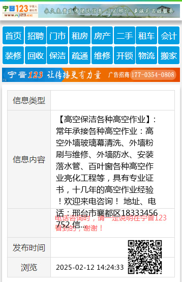 【高空保洁各种高空作业】:常年承接各种高空作业:高空外墙玻璃幕清洗、外墙粉刷与维修、外墙防水、安装落水管、百叶窗各种高空作业亮化工程等,具有专业证书,十几年的高空作业经验!欢迎来电咨询! 地址、电话:邢台市襄都区18333456752 信