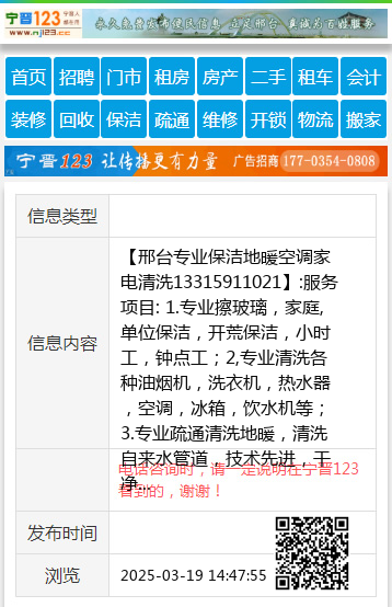 【邢台专业保洁地暖空调家电清洗13315911021】:服务项目: 1.专业擦玻璃,家庭,单位保洁,开荒保洁,小时工,钟点工;2,专业清洗各种油烟机,洗衣机,热水器,空调,冰箱,饮水机等;3.专业疏通清洗地暖,清洗自来水管道,技术先进,干净彻底,更换分水器;4.专业管道疏通,疏通厨卫下水道,马桶;5.更换各种窗纱;6,开锁,换锁;7.甲醛检测,治理;8.食堂,饭店,酒店大型油烟机烟罩烟道净化器清洗,承接学校,单位等各种保洁。从业多年,收费合理 地址、电话:桥东5208787桥西2224399 |