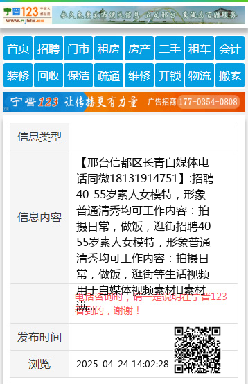 【邢台信都区长青自媒体电话同微18131914751】:招聘40-55岁素人女模特,形象普通清秀均可工作内容:拍摄日常,做饭,逛街招聘40-55岁素人女模特,形象普通清秀均可工作内容:拍摄日常,做饭,逛街等生活视频用于自媒体视频素材素材满一小时结算一次工资,当场结算,联系电话同微18131914751生活视频用于自媒体视频素材素材满一小时结算一次工资,联系电话同微18131914751 地址、电话:电话同微18131914751 |