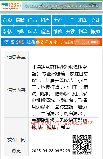 【保洁免砸砖做防水瓷砖空鼓】:专业擦玻璃,家庭日常保洁,新居开荒保洁,小时工,地板打蜡,小时工 ,清洗油烟机,维修煤气灶,家电维修清洗,换纱窗,马桶周边渗水,瓷砖空鼓,翘边,卫生间漏水,厨房漏水,免砸砖维修,见效快不影响使用。 地址、电话:13113453777