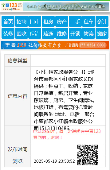【小红帽家政服务公司】:邢台市襄都区小红帽家政长期提供;钟点工、收纳,家庭日常保洁,新居开荒,专业擦玻璃;厨房、卫生间清洗。地板打蜡,有需要的抓紧时间联系哟 地址、电话:邢台市襄都区小红帽家政服务公司15131310486