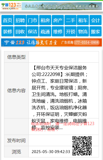 【邢台市天天专业保洁服务公司:2222098】:长期提供;钟点工、家庭日常保洁,新居开荒,专业擦玻璃;厨房、卫生间清洗。地板打蜡。清洗地暖,清洗油烟机,冰箱洗衣机,饭店油烟机净化器,开环保证明,灭蟑螂灭蚂蚁灭鼠,家电维修,电脑维修,监控安装,空调移机加氟清洗,管道类:疏通上下水道,马桶:疏通各种型号马桶,便池,因抹布、清洁球、塑料等各种软硬物质所造成的堵塞。上下水改装,换雨水管。防盗门开通风窗,开锁换锁芯 地址、电话:2222098手机:13180566945 |
