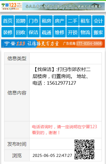 【找保洁】:打扫市郊农村二层楼房,归置房间。 地址、电话:15612977127