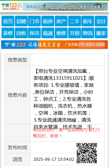 【邢台专业空调清洗加氟,家电清洗13315911021】:服务项目: 1.专业擦玻璃,家庭,单位保洁,开荒保洁,小时工,钟点工;2,专业清洗各种油烟机,洗衣机,热水器,空调,冰箱,饮水机等;3.专业疏通清洗地暖,清洗自来水管道,技术先进,干净彻底,更换分水器;4.专业管道疏通,疏通厨卫下水道,马桶;5.更换各种窗纱;6,开锁,换锁;7.甲醛检测,治理;8.食堂,饭店,酒店大型油烟机烟罩烟道净化器清洗,承接学校,单位等各种保洁。从业多年,收费合理 地址、电话:桥东5208787桥西2224399 |