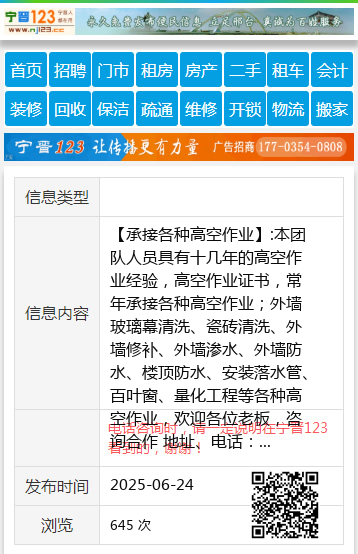 【承接各种高空作业】:本团队人员具有十几年的高空作业经验,高空作业证书,常年承接各种高空作业;外墙玻璃幕清洗、瓷砖清洗、外墙修补、外墙渗水、外墙防水、楼顶防水、安装落水管、百叶窗、量化工程等各种高空作业,欢迎各位老板,咨询合作 地址、电话:襄都区18333456752同微信