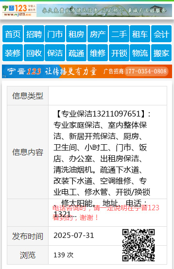 【专业保洁13211097651】:专业家庭保洁、室内整体保洁、新居开荒保洁、厨房、卫生间、小时工、门市、饭店、办公室、出租房保洁、清洗油烟机。疏通下水道、改装下水道、空调维修、专业电工、修水管、开锁/换锁、修太阳能。 地址、电话:13211097651