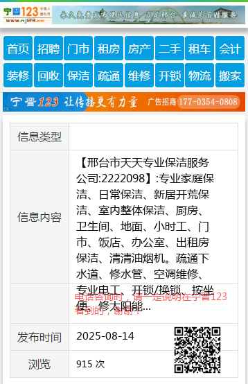【邢台市天天专业保洁服务公司:2222098】:专业家庭保洁、日常保洁、新居开荒保洁、室内整体保洁、厨房、卫生间、地面、小时工、门市、饭店、办公室、出租房保洁、清清油烟机。疏通下水道、修水管、空调维修、专业电工、开锁/换锁、按坐便、修太阳能。 地址、电话:2222098手机:13180566945