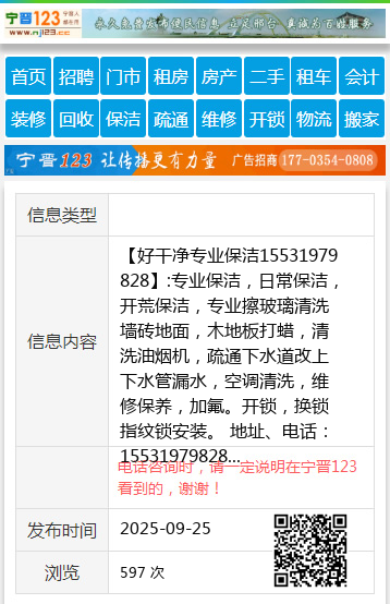 【专业保洁】:专业擦玻璃,家庭日常整体保洁,清洗地面,墙砖,厨房,卫生间,地板打蜡,瓷砖美缝,新居开荒,家庭保洁,开荒保洁擦玻璃,擦厨房卫生间,小时工 等 … 地址、电话:18733916251