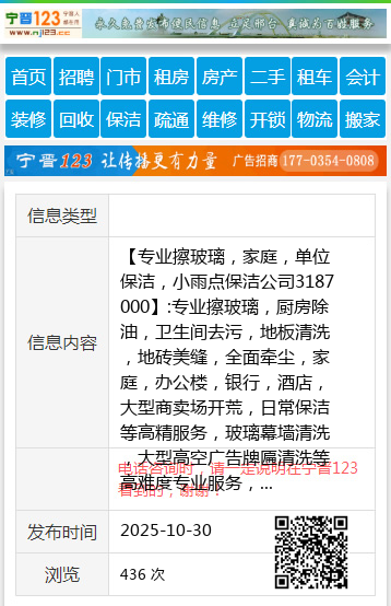 | 信息内容 | 【专业擦玻璃,家庭,单位保洁,小雨点保洁公司3187000】:专业擦玻璃,厨房除油,卫生间去污,地板清洗,地砖美缝,全面牵尘,家庭,办公楼,银行,酒店,大型商卖场开荒,日常保洁等高精服务,玻璃幕墙清洗,大型高空广告牌匾清洗等高难度专业服务, 公司成立最早,品牌大,证照齐全,可开增值发票,规模庞大,技术力量雄厚,设备先进,欢迎新老客户参观或电话垂询。 地址、电话:3187000 |