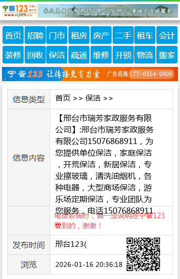 【邢台市瑞芳家政服务有限公司】:邢台市瑞芳家政服务有限公司15076868911,为您提供单位保洁,家庭保洁,开荒保洁,新居保洁,专业擦玻璃,清洗油烟机,各种电器,大型商场保洁,游乐场定期保洁,专业团队为您服务,电话15076868911 地址、电话:邢台市瑞芳家政服务有限公司,电话15076868911 【电话咨询时,请一定说明在邢台123看到的,谢谢!】 |