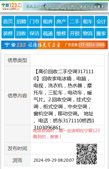【高价回收二手空调3171110】:回收家电冰箱,电脑,电视,洗衣机,热水器,摩托车,三轮车,电动车,暖气片。2.回收空调,挂式空调,柜式空调,中央空调,窗机空调,移动空调。 地址、电话:桥东3171110桥西13103096861