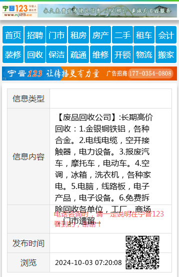 【废品回收公司】:长期高价回收:1.金银铜铁铝,各种合金。2.电线电缆,空开接触器,电力设备。3.报废汽车,摩托车,电动车。4.空调,冰箱,洗衣机,各种家电。5.电脑,线路板,电子产品,电子设备。6.免费拆除回收各单位,工厂,商场,门市遗留废旧物资。 地址、电话:邢台市森林公园东华北汽车城附近。电话:15613991919 |