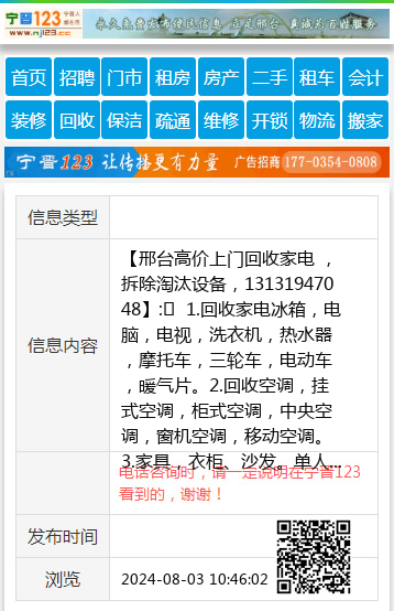 【邢台高价上门回收家电 ,拆除淘汰设备,13131947048】: 1.回收家电冰箱,电脑,电视,洗衣机,热水器,摩托车,三轮车,电动车,暖气片。2.回收空调,挂式空调,柜式空调,中央空调,窗机空调,移动空调。3.家具,衣柜、沙发。单人床, 双人床,办公家具.4.回收门窗,塑钢门窗,铝合金门窗,断桥铝门窗,拆卸各种门窗.废铁,废铝,废铜,厂房,彩钢瓦房,钢结构,厂厍堆放的,淘汰的一切废旧物资。电话13131947048 同步。 地址、电话:13131947048 上门回收 |