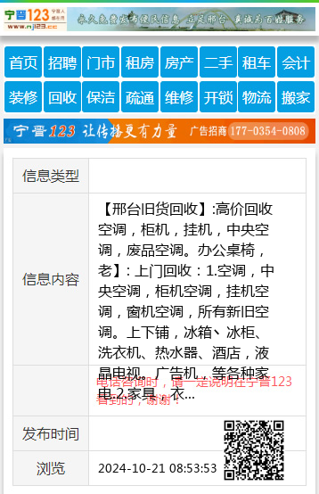 【邢台旧货回收】:高价回收空调,柜机,挂机,中央空调,废品空调。办公桌椅,老】: 上门回收:1.空调,中央空调,柜机空调,挂机空调,窗机空调,所有新旧空调。上下铺,冰箱丶冰柜、洗衣机、热水器、酒店,液晶电视。广告机,等各种家电.2.家具,衣柜、沙发。单人床, 双人床,办公家具.3.电脑 ,台式电脑主机,显示器,笔记本,(学校及网吧淘汰机).4.饭店桌椅板凳,厨房用品.5.电动车,摩托车,电瓶,旧电动自行车 地址、电话:13831933057 |