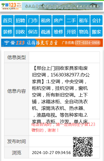 【邢台上门回收家具家电废旧空调,15630382977.办公家具】:1.空调,中央空调,柜机空调,挂机空调,窗机空调,所有新旧空调。上下铺,冰箱冰柜、全自动洗衣机、滚筒洗衣机、热水器、,液晶电视。等各种家电.2.家具,衣柜、沙发。单人床, 双人床,办公家具.3.电脑 ,台式电脑主机,显示器,笔记本,(学校单位及网吧淘汰机).4.饭店桌椅板凳,厨房用品.5.电动车,摩托车,电瓶.6.银行设备,饭店用品,蛋糕房用品,办公家具,单位企业设备, 《拆除代扔废旧家具。》 地址、电话:15630382977 上门回收 |