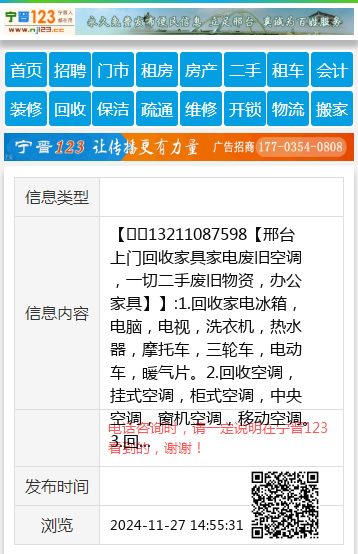 【☎️13211087598【邢台上门回收家具家电废旧空调,一切二手废旧物资,办公家具】】:1.回收家电冰箱,电脑,电视,洗衣机,热水器,摩托车,三轮车,电动车,暖气片。2.回收空调,挂式空调,柜式空调,中央空调,窗机空调,移动空调。3.回收旧家具,旧沙发,旧衣柜,旧床垫4.回收旧门窗,塑钢门窗,铝合金门窗,断桥铝门窗,拆卸各种门窗一切废旧物资5.回收办公家具,网吧清空,饭店用品,桌椅板凳,厨房用品,制冷设备。 地址、电话:手机13211087598 上门回收 |