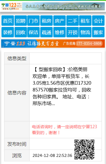 【 型搬家回收】:价格美丽欢迎单,单排平板货车,长3.05宽1.56市区优惠☎17320857570搬家拉货均可,回收各种旧家具。 地址、电话:邢东市场