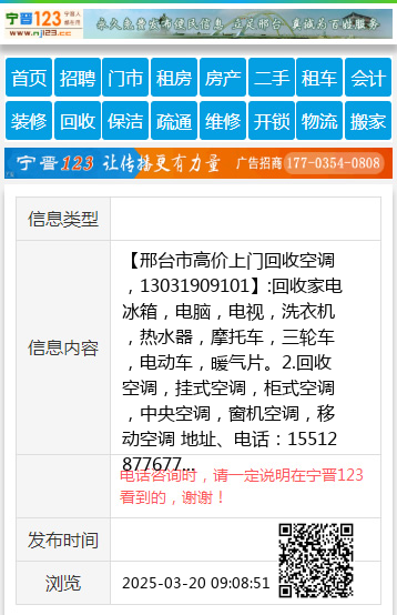 【13231993781 邢台上门回收空调】: 1.回收家电冰箱,电脑,电视,洗衣机,热水器,摩托车,三轮车,电动车,暖气片。2.回收空调,挂式空调,柜式空调,中央空调,窗机空调,移动空调。3.回收旧家具,旧沙发,旧衣柜,旧床垫,旧床,清理旧家具,清理木头家具,清理木制地板,4.回收旧门窗,塑钢门窗,铝合金门窗,断桥铝门窗,拆卸各种门窗一切废旧物资5.回收办公家具,网吧清空,饭店用品,桌椅板凳,厨房用品,制冷设备 地址、电话:邢台上门回收空调 13231993781 上门回收