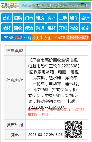 【邢台市高价回收空调电视电脑电动车三轮车2222338】:回收家电冰箱,电脑,电视,洗衣机,热水器,摩托车,三轮车,电动车,暖气片。2.回收空调,挂式空调,柜式空调,中央空调,窗机空调,移动空调 地址、电话:2222338--15690375321