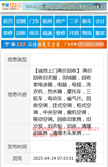 【诚信上门高价回收】:高价回收旧衣服,羽绒服,回收家电冰箱,电脑,电视,洗衣机,热水器,摩托车,三轮车,电动车,暖气片。回收空调,挂式空调,柜式空调,中央空调,窗机空调,移动空调。回收旧家具,旧沙发,旧衣柜,旧床,清理旧家具,清理木头家具,清理木制地板,回收旧门窗,塑钢门窗,铝合金门窗,断桥铝门窗,拆卸各种门窗一切废旧物资回收办公家具,网吧清空,饭店用品,桌椅板凳,厨房用品,制冷设备,拆除门窗,0319-3826650 13229890839微信同步 地址、电话:开元路18333985418 地址、电话:18333985418 |