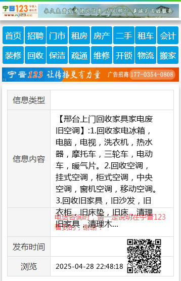 【邢台上门回收家具家电废旧空调】:1.回收家电冰箱,电脑,电视,洗衣机,热水器,摩托车,三轮车,电动车,暖气片。2.回收空调,挂式空调,柜式空调,中央空调,窗机空调,移动空调。3.回收旧家具,旧沙发,旧衣柜,旧床垫,旧床,清理旧家具,清理木头家具,清理木制地板,4.回收旧门窗,塑钢门窗,铝合金门窗,断桥铝门窗,拆卸各种门窗一切废旧物资 地址、电话:邢台桥东,桥西区,13082036113 |