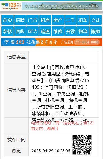 【义乌上门回收,家具,家电,空调,饭店用品,桌椅板凳,电动车】:《旧货回收电话3215499:上门回收一切旧货》】: 。1.空调,中央空调,柜机空调,挂机空调,窗机空调,所有新旧空调。上下铺,冰箱冰柜、全自动洗衣机、滚筒洗衣机、热水器、,液晶电视。等各种家电.2.家具,衣柜、沙发。单人床, 双人床,办公家具.3.电脑 ,台式电脑主机,显示器,笔记本,(学校单位及网吧淘汰机).4.饭店桌椅板凳,厨房用品.5.电动车,摩托车,电瓶.6.银行设备,饭店用品,蛋糕房用品,办公家具,单位企业设备, 《拆除代扔废旧家具。》 地址、电话:15531995951 |