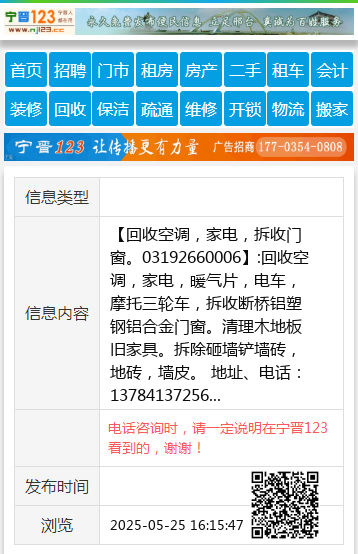 【回收空调,家电,拆收门窗。03192660006】:回收空调,家电,暖气片,电车,摩托三轮车,拆收断桥铝塑钢铝合金门窗。清理木地板旧家具。拆除砸墙铲墙砖,地砖,墙皮。 地址、电话:13784137256