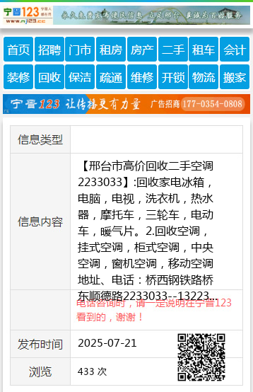 【邢台市高价回收二手空调2233033】:回收家电冰箱,电脑,电视,洗衣机,热水器,摩托车,三轮车,电动车,暖气片。2.回收空调,挂式空调,柜式空调,中央空调,窗机空调,移动空调 地址、电话:桥西钢铁路桥东顺德路2233033--13223256202