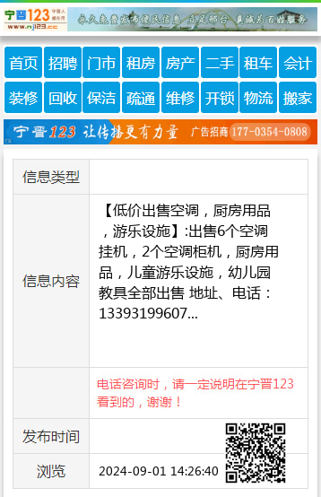 【低价出售空调,厨房用品,游乐设施】:出售6个空调挂机,2个空调柜机,厨房用品,儿童游乐设施,幼儿园教具全部出售 地址、电话:13393199607