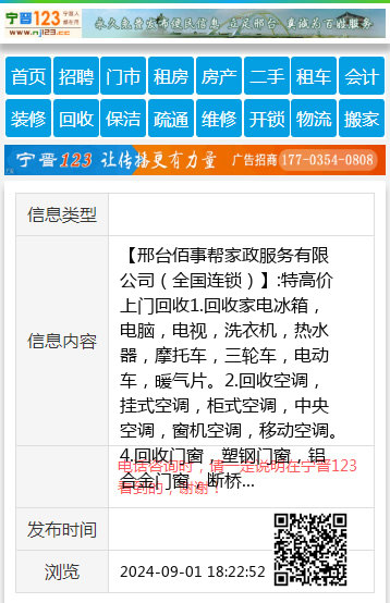 【邢台佰事帮家政服务有限公司(全国连锁)】:特高价上门回收1.回收家电冰箱,电脑,电视,洗衣机,热水器,摩托车,三轮车,电动车,暖气片。2.回收空调,挂式空调,柜式空调,中央空调,窗机空调,移动空调。4.回收门窗,塑钢门窗,铝合金门窗,断桥铝门窗,拆卸各种门窗.废铁,废铝,废铜,厂房,彩钢瓦房,钢结构电话:16633951168(同步) 地址、电话:16633951168 |