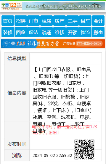 【上门回收旧衣服 、旧家具 、旧家电 等一切旧货】:上门回收旧衣服 、旧家具 、旧家电 等一切旧货】: 上门回收旧衣服、旧棉被,旧家具(床、沙发、衣柜、电视桌,餐桌,上下床),旧家电(冰箱、空调、洗衣机、电视、电脑),电动车,三轮车,山地车,自行车,跑步机,厨房用品,拆门窗,铝门窗,塑钢门窗,防盗门,暖气片,热水器,旧电瓶,木地板,旧书报 ,废木头等搬家、装修淘汰的二手闲置物品 地址、电话:13931961311 地址、电话:13931961311 |