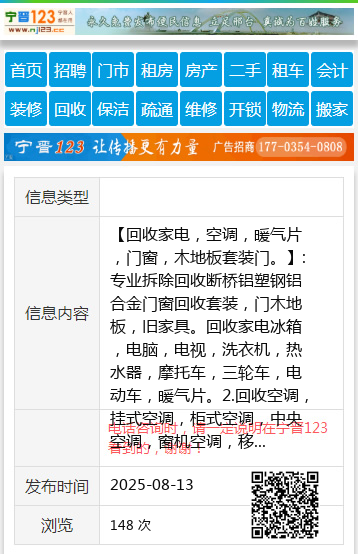 【回收家电,空调,暖气片,门窗,木地板套装门。】:专业拆除回收断桥铝塑钢铝合金门窗回收套装,门木地板,旧家具。回收家电冰箱,电脑,电视,洗衣机,热水器,摩托车,三轮车,电动车,暖气片。2.回收空调,挂式空调,柜式空调,中央空调,窗机空调,移动空调。3.回收旧家具,旧沙发,旧衣柜,旧床垫,旧床,清理旧家具,清理木头家具,清理木制地板,4.回收旧门窗,塑钢门窗,铝合金门窗,断桥铝门窗,拆卸各种门窗一切废旧物资5.回收办公家具,网吧清空,饭店用品,桌椅板凳,厨房用品,制冷设备 地址、电话:13784137256 |