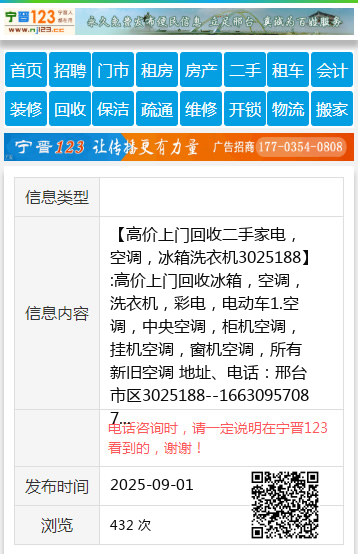 【高价上门回收二手家电,空调,冰箱洗衣机3025188】:高价上门回收冰箱,空调,洗衣机,彩电,电动车1.空调,中央空调,柜机空调,挂机空调,窗机空调,所有新旧空调 地址、电话:邢台市区3025188--16630957087