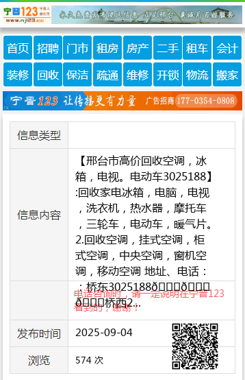 【邢台市高价回收空调,冰箱,电视。电动车3025188】:回收家电冰箱,电脑,电视,洗衣机,热水器,摩托车,三轮车,电动车,暖气片。2.回收空调,挂式空调,柜式空调,中央空调,窗机空调,移动空调 地址、电话:桥东3025188桥西22222008
