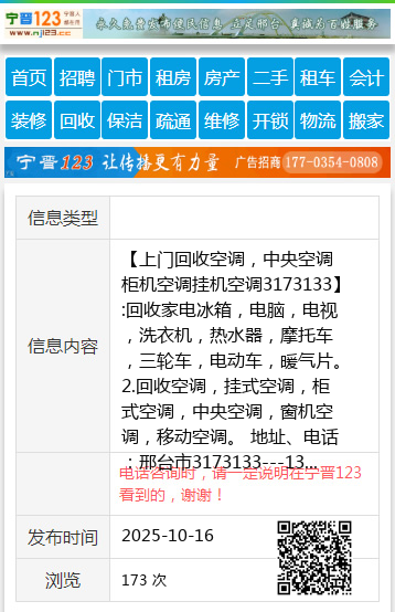【上门回收空调,中央空调柜机空调挂机空调3173133】:回收家电冰箱,电脑,电视,洗衣机,热水器,摩托车,三轮车,电动车,暖气片。2.回收空调,挂式空调,柜式空调,中央空调,窗机空调,移动空调。 地址、电话:邢台市3173133---13231925363