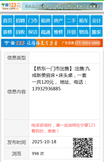 【桥东一门市出售】:出售:九成新美容床+床头桌,一套一共120元, 地址、电话:13932936885
