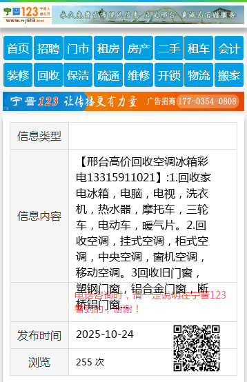 【邢台高价回收空调冰箱彩电13315911021】:1.回收家电冰箱,电脑,电视,洗衣机,热水器,摩托车,三轮车,电动车,暖气片。2.回收空调,挂式空调,柜式空调,中央空调,窗机空调,移动空调。3.回收旧家具,旧沙发,旧衣柜,旧床垫,旧床,清理旧家具,清理木头家具,清理木制地板,4.回收旧门窗,塑钢门窗,铝合金门窗,断桥铝门窗,拆卸各种门窗一切废旧物资5.回收办公家具,网吧清空,饭店用品,桌椅板凳,厨房用品,制冷设备 地址、电话:桥东5208787桥西2224399