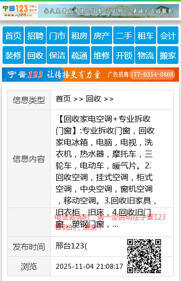 【回收家电空调+专业拆收门窗】:专业拆收门窗,回收家电冰箱,电脑,电视,洗衣机,热水器,摩托车,三轮车,电动车,暖气片。2.回收空调,挂式空调,柜式空调,中央空调,窗机空调,移动空调。3.回收旧家具,旧衣柜,旧床,4.回收旧门窗,塑钢门窗,铝合金门窗,断桥铝门窗,拆卸各种门窗一切废旧物资5.回收办公家具,网吧清空,饭店用品,桌椅板凳,厨房用品,制冷设备。邢台上门回收空调 地址、电话:13784137256 【电话咨询时,请一定说明在邢台123看到的,谢谢!】 |