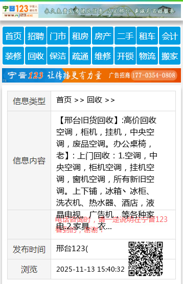 【邢台旧货回收】:高价回收空调,柜机,挂机,中央空调,废品空调。办公桌椅,老】: 上门回收:1.空调,中央空调,柜机空调,挂机空调,窗机空调,所有新旧空调。上下铺,冰箱丶冰柜、洗衣机、热水器、酒店,液晶电视。广告机,等各种家电.2.家具,衣柜、沙发。单人床, 双人床,办公家具.3.电脑 ,台式电脑主机,显示器,笔记本,(学校及网吧淘汰机).4.饭店桌椅板凳,厨房用品.5.电动车,摩托车,电瓶,旧电动自行车 地址、电话:13831933057 【电话咨询时,请一定说明在邢台123看到的,谢谢!】 |